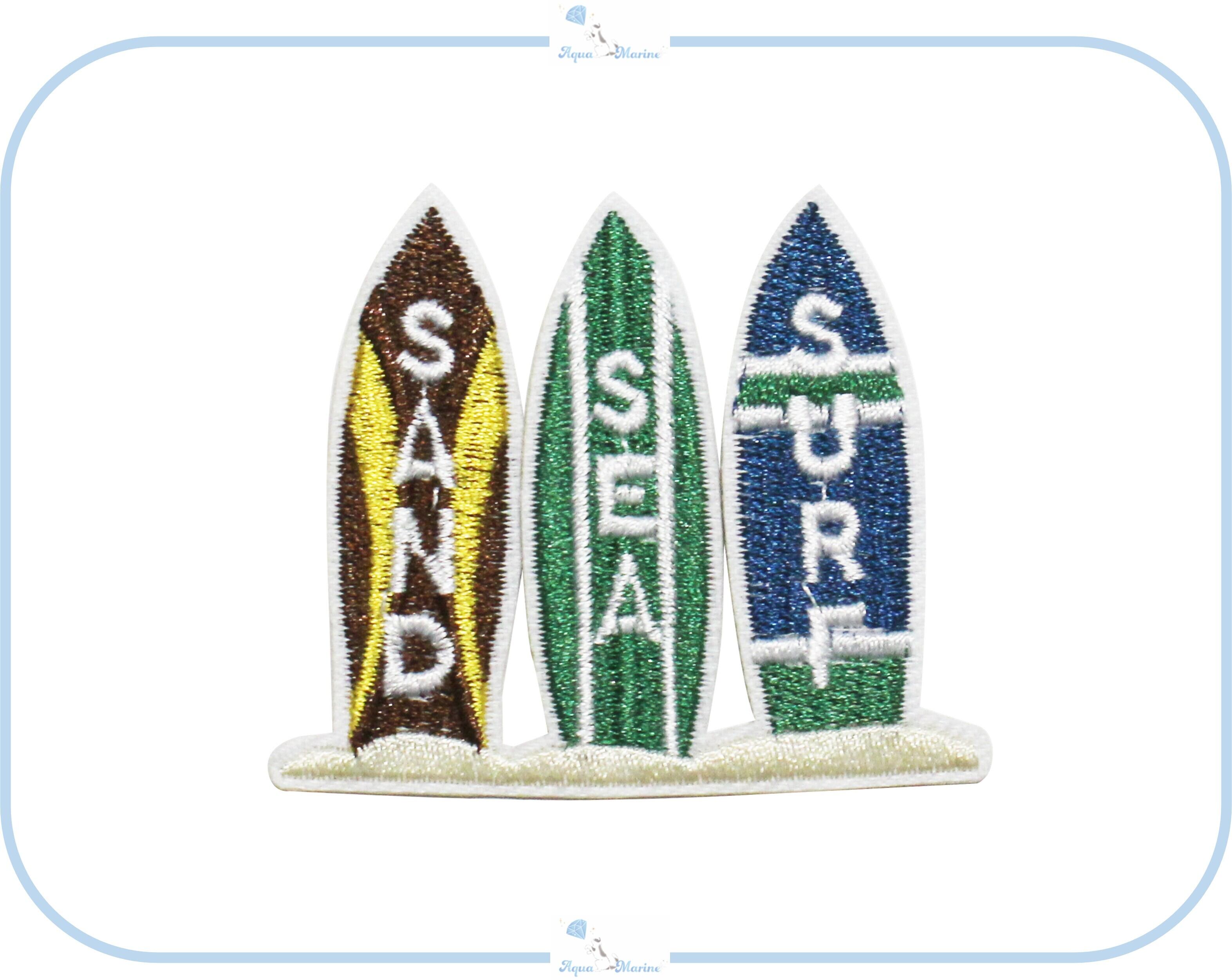 ES121 アップリケ 刺繍 サーフボード sand sea surf デザイン サーフィン 波乗り 海 ブルー グリーン ブラウン ハンドメイド 材料 アイロン ワッペン リメイク アレンジ 服飾 手芸